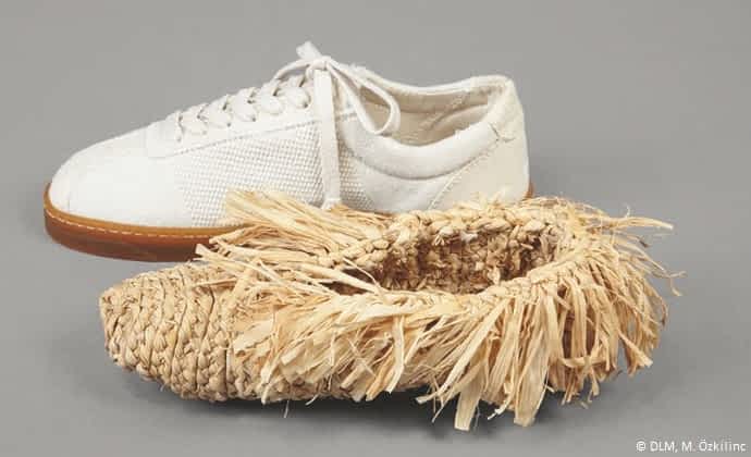 • Nachhaltigkeit – Damals wie Heute: Ein moderner Sneaker aus Vancouver (The Plant Shoe, 2019), gefertigt aus Ananasfasern, Mais und Kork, traf auf einen nordamerikanischen Mokassin von 1970 aus schlichtem Maisstroh. Beide beweisen: Leder ist kein Muss für einen guten Schuh.